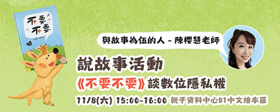 台灣展翅協會因應家長關注的網路安全議題,舉辦生動有趣的《不要不要》繪本互動展,藉由故事中袋鼠媽媽拍照上傳到網路,導致後續引發的事件,傳遞在快速變遷的網路時代下,我們該如何保護孩子的網路隱私與尊重兒童權益呢?